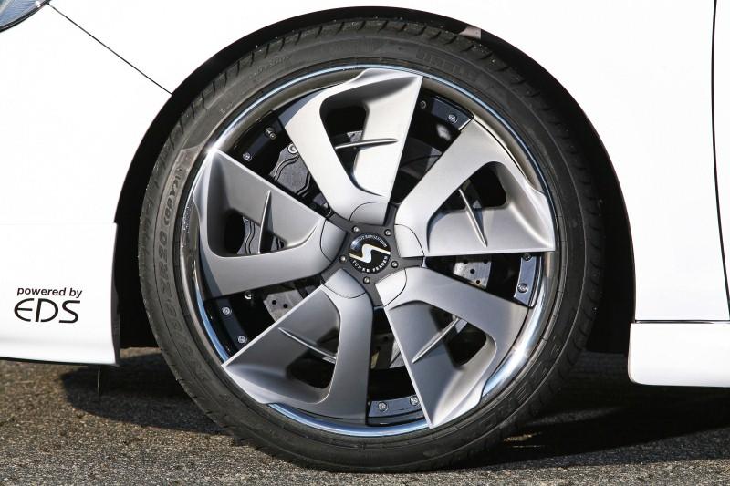 Einmal mehr obliegt es einer adäquaten Rad/Reifen-Kombination, diese Kraft auch auf den Asphalt zu bringen. Sehenswerte Jack-Line-Felgen mit Cirrus Dekorteile „Titan“ in 8,5 x 20 Zoll vorne und 9,5 x 20 Zoll hinten aus dem unerschöpflich scheinenden Arsenal von Schmidt Revolution aus Bad Segeberg wurden mit Pirelli P.Zero in 235/35ZR20 an der Vorderachse und 275/30ZR20 an der Hinterachse zum Paketpreis von 3.200,- Euro bezogen. Die passgenau angefertigte Cirrus-Dekorteile gibt es in acht verschiedenen Farben - Schwarz, Chrom, Carbon, Rot, Silber, Titan, Weiß und Gelb bei www.FELGE.de zu bestellen. Im Gesamtbild unbestreitbar eine Augenweide.
